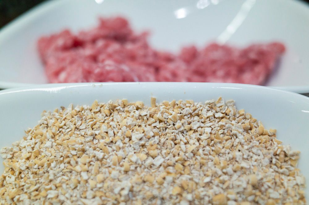 There's no real consensus on what exactly goes into goetta. Many recipes seem to agree that there are roughly equal parts of pork and beef, a generous portion of steel-cut oats, bay leaves, salt, and spices. In this version, there's also chile, garlic, sage, and marjoram, along with a scoop of mustard seeds for texture. As a side benefit, the goetta should be gluten-free.